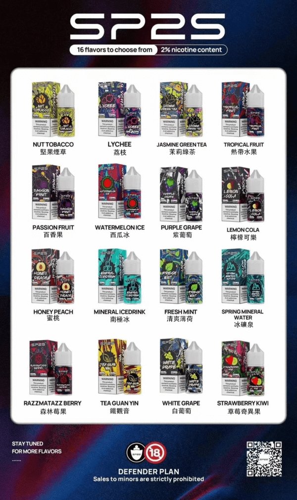 - 多口味選擇: SP2S 煙油擁有16種口味選擇,滿足不同喜好。